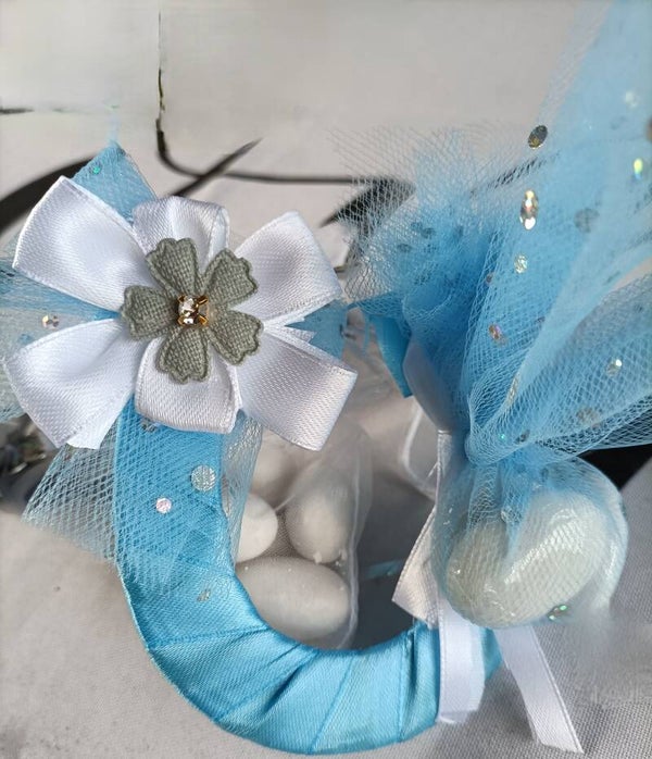 Bellissima idea da utilizzare per eventi tipo nascita Battesimo 1 compleanno baby shower. Ferro di cavallo in legno rivestito in raso con applicazioni fiore compreso 5 confetti al cioccolato in sacchetto salva fragranza avvolti in tulle. Prodotto ordinabile su richiesta per info ordini contattare …