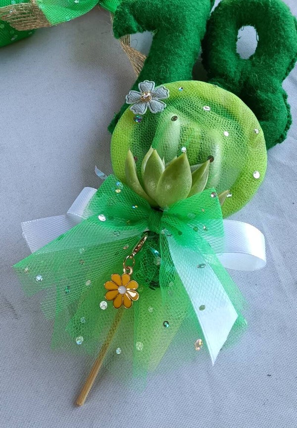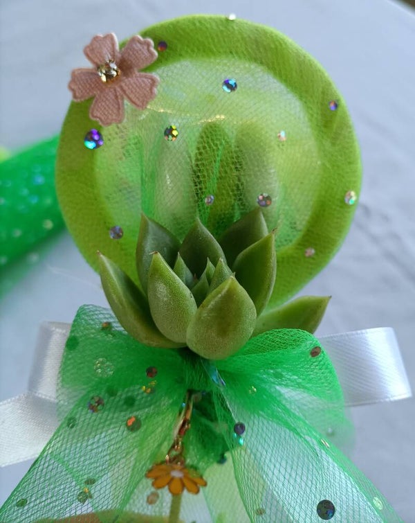 Bomboniera cerchio con tulle e 3 confetti al cioccolato, piantina idroponica (echeveria) e ciondolo fiore.