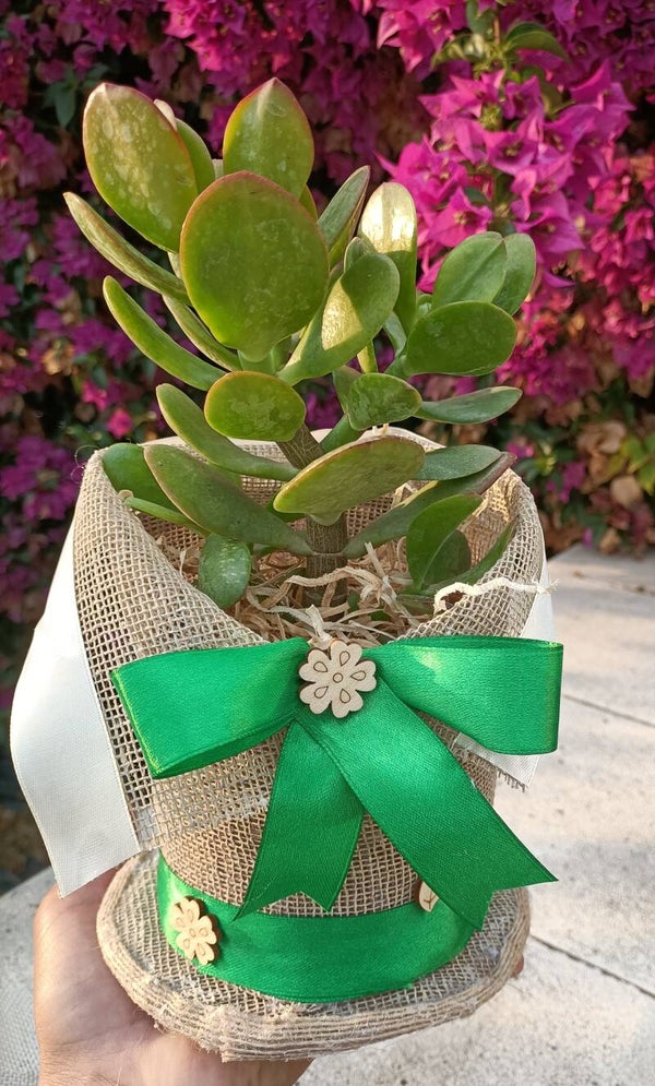 Grassula in Frank o Echeveria in Yututu! pianta con vaso in terracotta completa di decorazioni che richiama un abito elegante da festa.
