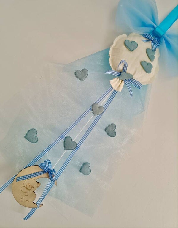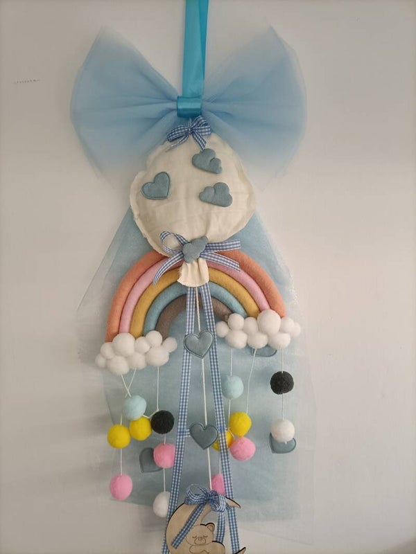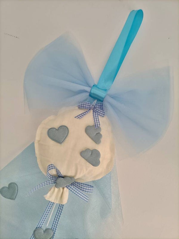 Fiocco nascita tulle con palloncino in cotone e applicazioni in cotone e legno.