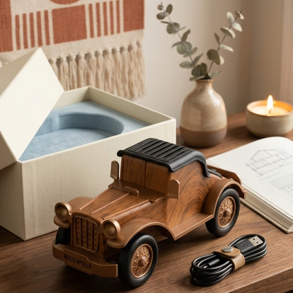 Mini Cassa Bluetooth - Auto d’Epoca, unisce il fascino vintage delle auto d’epoca alla comodità della tecnologia moderna. Con il suo design a forma di intramontabile automobile, questo altoparlante compatto funge anche da pratico supporto per smartphone, diventando un elemento decorativo e funzionale perfetto per scrivanie, scaffali o comodini. I dettagli effetto legno valorizzano il suo carattere nostalgico, rendendolo al contempo armonioso in qualsiasi ambiente contemporaneo.